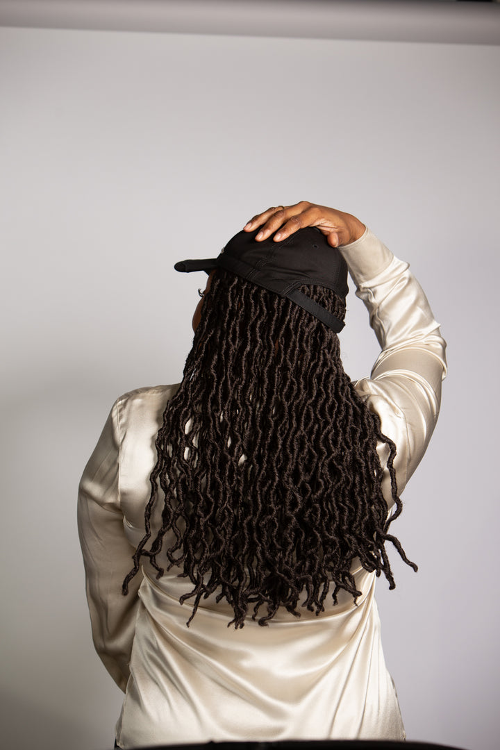Model is wearing Kimmie Cap | Long Synthetic 18" Faux Loc Wig in Dark Brown.